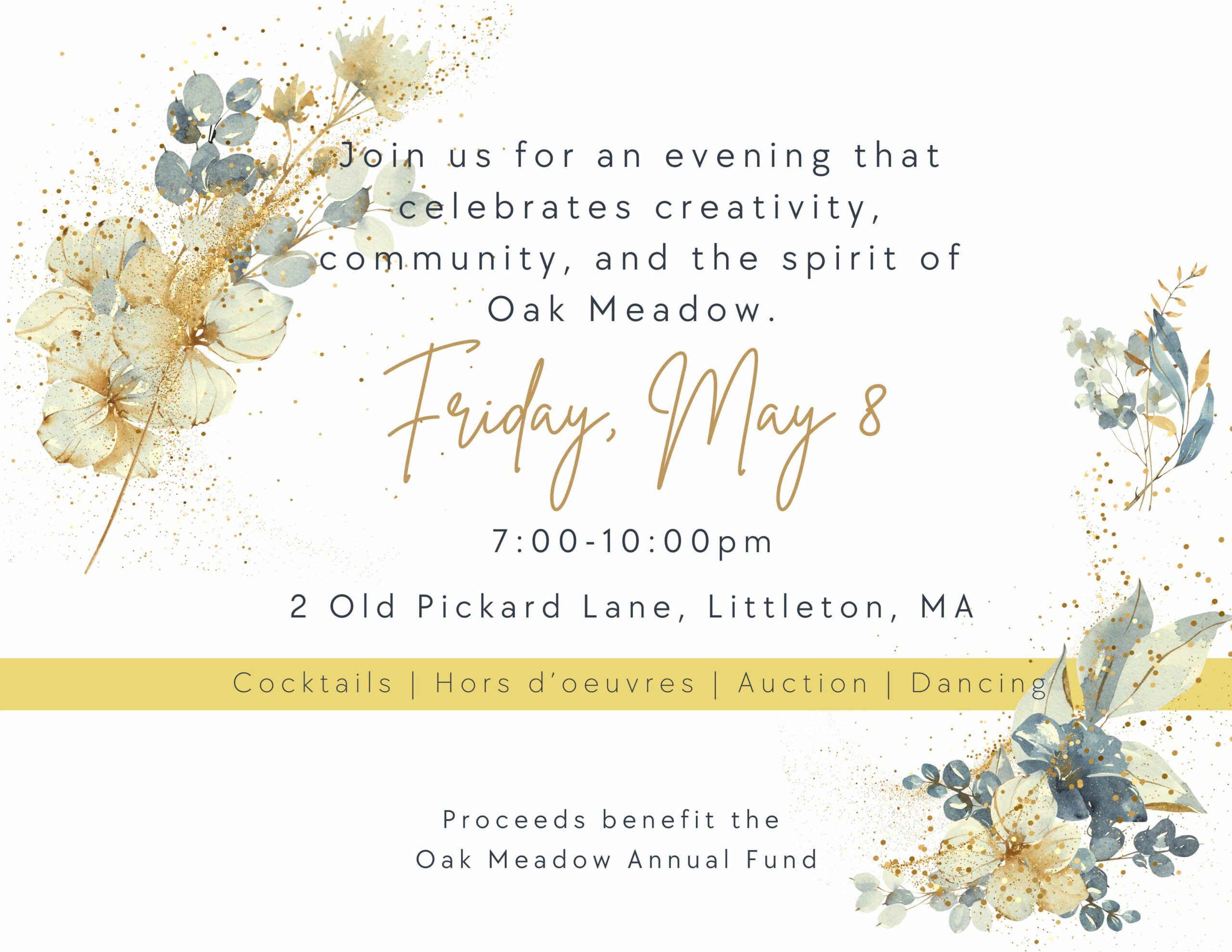 The gala takes place on Friday, May 8, 2026 from 7:00–10:00 PM at Oak Meadow Montessori School.